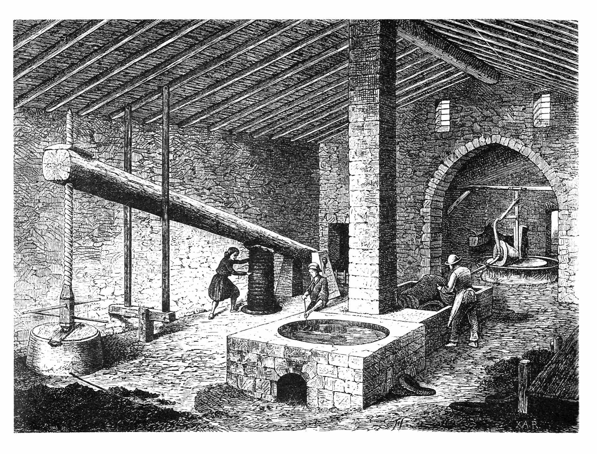 La tria era la tercera i darrera fase. L’oli corria cap a les piques on les morques i l’aigua quedaven a baix i l’oli, que pesa menys, surant a sobre.